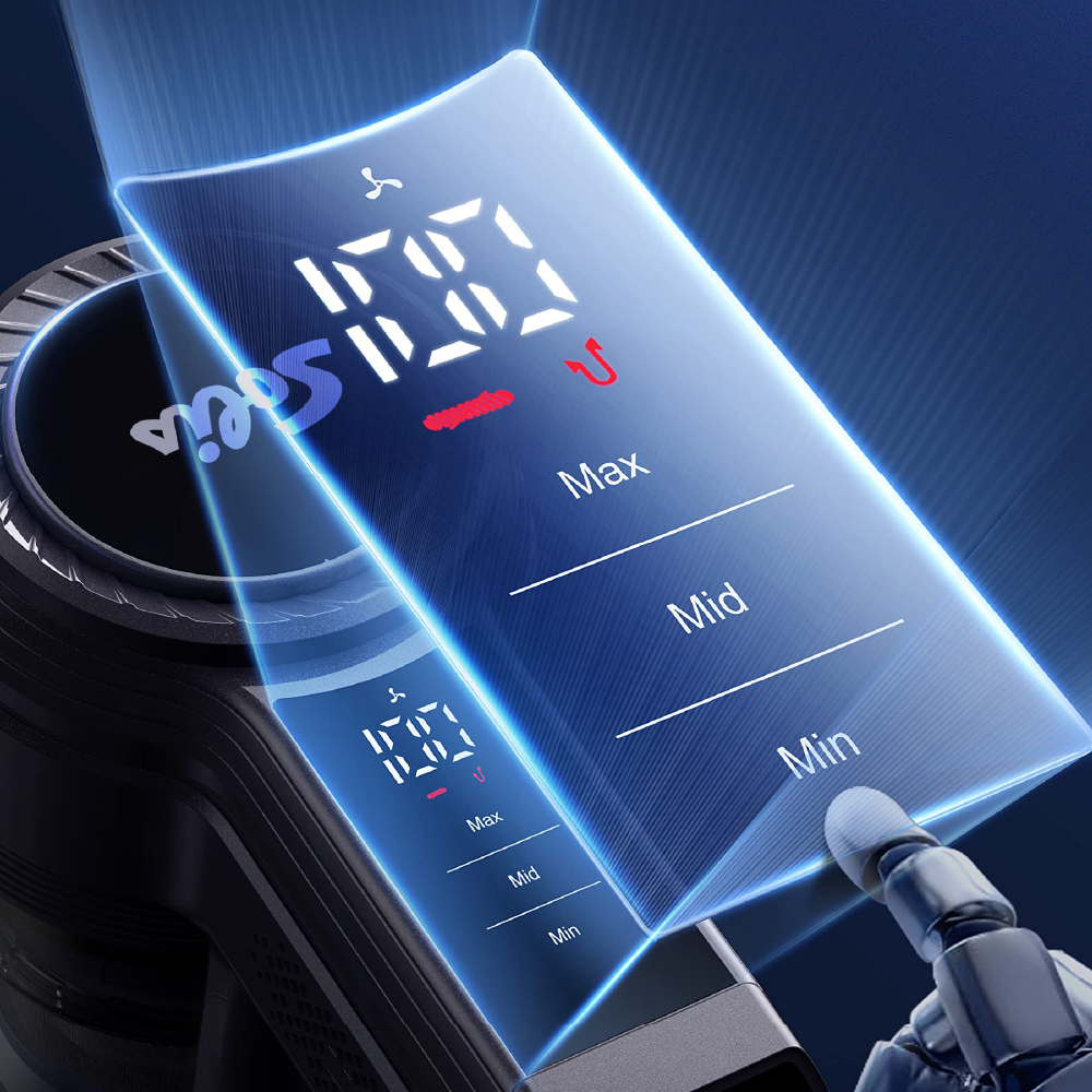 L’écran affiche l’état de charge en % en temps réel, ainsi qu’un éventuel blocage de la brosse ou une obstruction du conduit d’air.