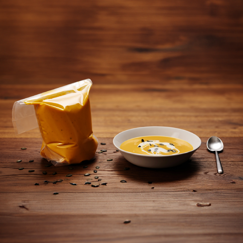 ALes canaux des deux côtés du film permettent d’extraire complètement l’air. Le film à trois couches d’une épaisseur de 110 μm empêche de manière fiable la pénétration d’humidité et d’oxygène et rend les sacs adaptés à la cuisson sous vide (< 100 ºC), et à une conservation au congélateur sans risque de brûlure de congélation (> -20 ºC).