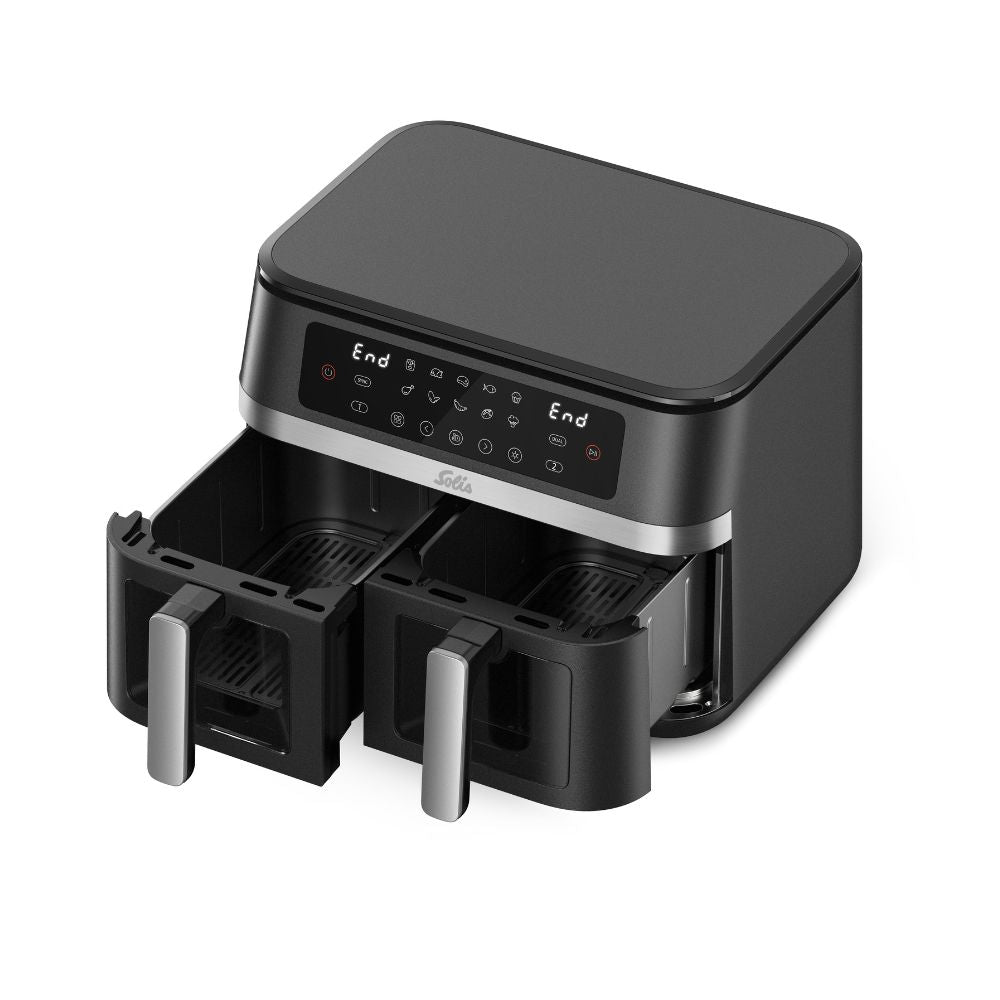 Twee onafhankelijke lades van 5,5L. Verschillende gerechten tegelijk – op verschillende temperaturen en tijden. De Solis Air Fryer Duo levert knapperige resultaten met weinig tot geen olie, compact en efficiënt.