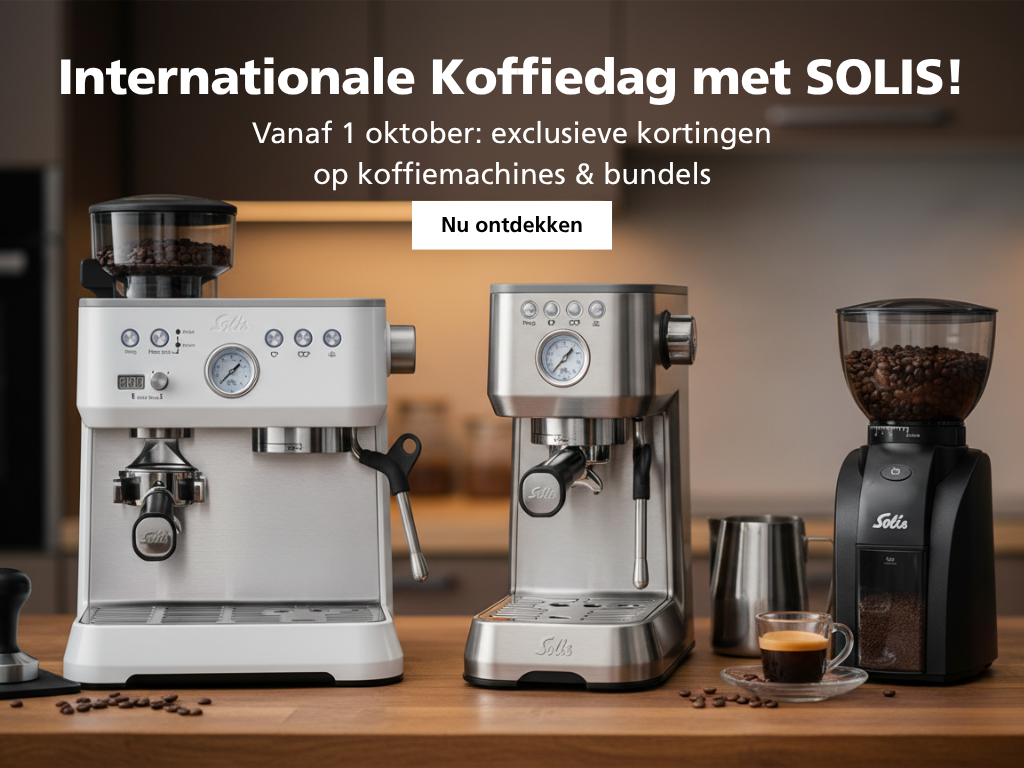 Vier de internationale espresso maand met de machines van Solis en maak van elk kopje een perfect moment. Alleen in oktober ontvangt u niet alleen 20% korting op onze espresso machines, maar ook krijgt u een gratis verpakking Solitabs voor eenvoudige reiniging en onderhoud. Plus, geniet van exclusieve bundles met een korting die oploopt tot 27%.
